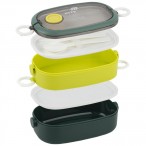 Прозора верхня кришка з клапаном дозволяє розігрівати страву в мікрохвильовці (достатньо просто відкрити клапан), а надійні бічні клямки фіксують обидві ємності разом.