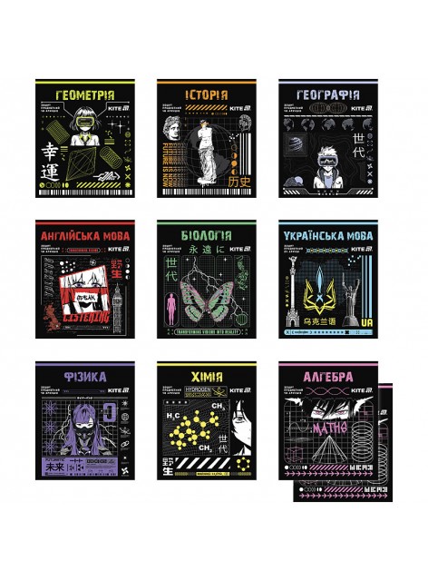 • в наборі – 10 предметних зошитів. З них 48 аркушів це - Алгебра (2 шт), Географія, Геометрія, Історія, Фізика, Хімія, Біологія, Англійська мова; 24 аркуші - Українська мова;