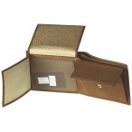 Трёхразворотное мужское горизонтальное портмоне. Внутри имеет два отдела для купюр, монетницу, семь отделов для кредитных карт и три прозрачных отсека для документов. Размер: 130x100 мм.