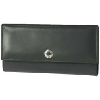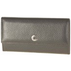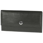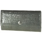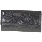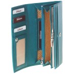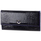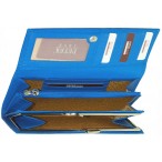 Женский большой кошелек. Внутри находится два отделения для купюр, между ними дополнительное отделение на молнии, большая монетница (закрывается стальной защелкой "поцелуйчиком"), десять отделений для кредиток, два больших и один маленький боковые карманы, а также одно прозрачное отделение. Размер: 190х100 см.