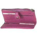 Женская модель кошелька на ровную купюру. Закрывается хлястиком на кнопке. Имеет большое отделение на всю площадь кошелька на молнии. В середине расположены, два боковых кармана для купюр, отделение на молнии можно использовать как мелочницу, двенадцать отделений для кредиток.
