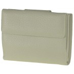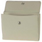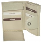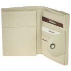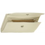 Женский многофункциональный кошелек. С лицевой стороны основное отделение закрывается хлястиком на кнопке. Имеет два отдела для купюр, 12 отделений для кредиток, один потайной и два боковых кармана, а также откидной карман-клапан с прозрачным окошком для документов. С тыльной стороны находится карманчик для мелочи, разделенный перегородкой на две секции (закрывается клапаном на кнопке). Размер: 145х110 мм.