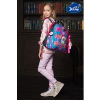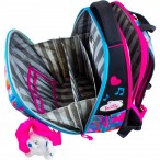 Благодаря уникальной форме, ранец выглядит компактно, но в то же время в нем можно удобно разместить все необходимые принадлежности для школы. Ранец имеет 2 отделения. При открытии центрального отделения раздвигаются разделители (книжка). Внутри расположено отделение для письменных принадлежностей. Второе отделение, для папок, рабочих тетрадей и высоких книг. Два боковых кармана на молнии, внутри которых расположена сеточка для бутылки. Внутри, информационная нашивка для внесения данных о владельце и карточка расписания уроков на неделю.