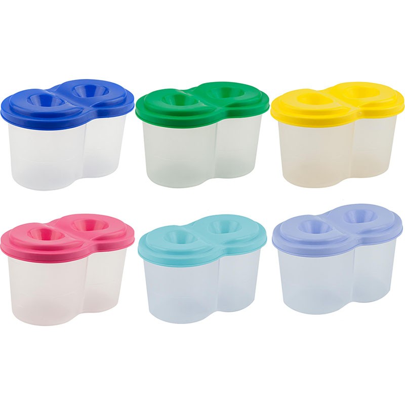 Подвійний стакан дуже зручний для тривалого малювання: він розділений на 2 частини, вода в яких не змішується. Це дозволяє подовжити процес створення художніх шедеврів, адже вода буде забруднюватися не так швидко. Одну частину ємності можна використовувати для очищення пензлика від світлих кольорів, іншу - для темних.