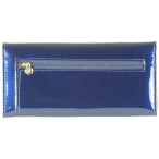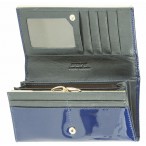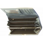 Женский большой кошелек. Внутри находится три отделения для купюр, большая монетница (закрывается стальной защелкой "поцелуйчиком"), восемь отделений для кредиток, два больших боковых кармана, один из которых закрывается на молнию, а также одно прозрачное отделение. На задней стенке кошелька снаружи расположена еще одна монетница на молнии. Размер: 185х95 мм.